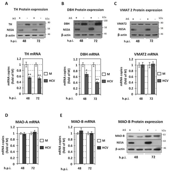 Effect of HCV infection on TH, DBH, VMAT2 and MAO levels. Huh7.5 cells were inoculated with Jc1 (MOI = 1), or mock-infected (M) and further cultured for the indicated h.p.i. (A–C upper and E right panels). Western blot analysis using anti-TH (A), anti-DBH (B), anti-VMAT2 (C) or anti MAO-B (E) antibodies. Viral infection was confirmed using anti-NS5A antibody. Mock-infected cells were used in parallel and are symbolized as Jc1 (−). β-actin was used as loading control. A representative experiment of three independent repetitions is shown. (A–C lower panel, D,E left panel) RT-qPCR analysis of TH, DBH, VMAT2, MAO-A and MAO-B mRNA levels normalized to YWHAZ mRNA. Values are expressed relative to the ones derived from mock-infected (M) cells, at each time-point. Bars represent mean values from three independent experiments in triplicate. Error bars indicate standard deviations. * p < 0.01, ** p < 0.001 vs. Control.
