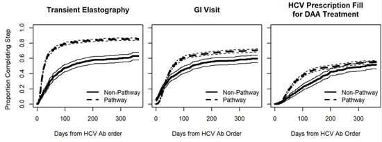 The adjusted hazard ratios of completing hepatic transient elastography, a gastroenterology visit, and DAA treatment were higher for HCV pathway patients than for usual care patients (2.43, 1.36, and 1.34 respectively; p < 0.001; Table 4). Unadjusted time-to-event analysis estimated that patients whose first HCV Ab order was through the HCV pathway were more likely to complete the relevant cascade of care events (hepatic transient elastography, a gastroenterology visit, and prescription fills) in a shorter time than patients whose first HCV Ab order was through usual care (Figure 1). In comparing patients tested through the HCV pathway to those tested through usual care, the estimated median time to complete hepatic transient elastography (26 vs. 118 days), a gastroenterology visit (63 vs. 131 days), and prescription fills (222 vs. 326 days) was lower for patients tested through the HCV pathway (Table S1).