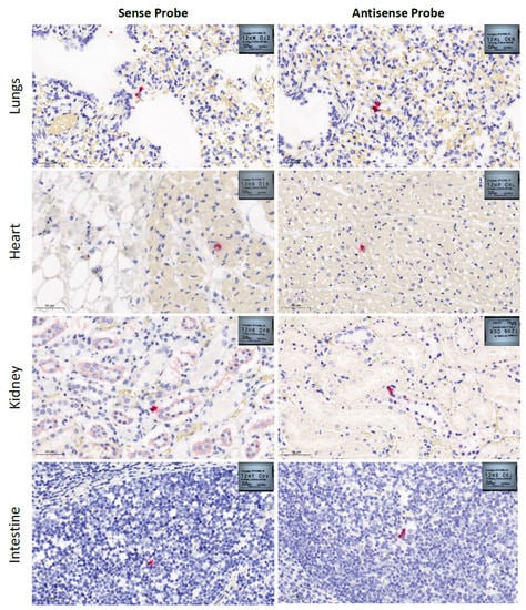 SARS-CoV-2 RNA in situ hybridization (ISH) images generated from RNAscope LS RED Singleplex ISH assays performed in formalin-fixed-paraffin-embedded (FFPE) canine tissue samples using RNAscope® 2.5 LS Probe-V-nCoV2019-S and RNAscope® 2.5 LS Probe-V-nCoV2019-orf1ab-sense (Advanced Cell Diagnostics, Bio-Techne, Minneapolis, MN, USA). Sections of lungs, heart, kidney, and intestine from a SARS-CoV-2 exposed dog showing red staining that represent RNAscope probes hybridized with SARS-CoV-2 positive (sense) and negative (antisense) RNA. Lungs presented marked pulmonary congestion and edema, moderate fibrin in alveoli, desquamated pneumocytes, and hyaline membranes. Heart presented epicardial edema and mild interstitial hemorrhage. No pathological changes were observed in kidneys or intestines. Hematoxylin and eosin staining, scale bars 50 µm. Images were generated with SlideViewer 2.5.0.143918 software (3DHISTECH Ltd., Budapest, Hungary).