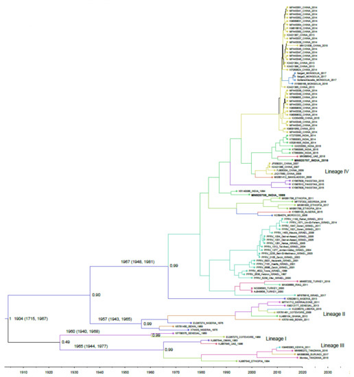 A regression of root-to-tip distances versus sampling dates was calculated using TempEst. The slope of the regression (representing the rate) was 5.0229 × 10−4, with a correlation coefficient (variation in rate) of 0.8944, R-squared value of 0.7999, and residual mean squared value of 6.6524 × 10−6, indicating a stronger temporal signal in the data set for molecular clock analysis. The PPRV isolates were categorized into four distinct lineages (I−IV) in the maximum clade credibility (MCC) tree, as determined in previous investigations (Figure 1). The Indian isolates studied in this investigation were found to be divided into two sub-clades within lineage IV. One sub-clade received 99 percent posterior probability support and included two samples that were acquired in 1994 and 1999. The other clade contained isolates collected in India between 2014 and 2016, as well as one isolate collected in the UAE in 2018, and was also supported by 99% posterior probability.