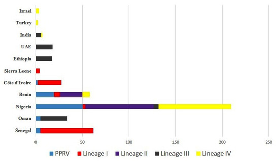 In addition to the two novel PPRV complete genome sequences generated in this study, all full genome sequences of PPRV (n = 94) available in Genbank (accessed on 1 September 2021) and 18 Israel full genome sequences of Clarke and colleagues [19] were included in the data set, making it a total of 114 sequences. However, 11 sequences with vaccine/reference strain sequences (highly passaged), incomplete sequences and sequences with recombination potential were excluded as these sequences could adversely bias outputs. This left a total of 103 sequences for subsequent analysis (Supplementary Table S1). Our data set contained sequences from 25 countries and had 24 more complete genome sequences compared to the previous analyses reported to date. Lineage IV dominated this data set with 85 sequences followed by lineage II (n = 9) and lineage III (n = 7). However, lineage I had the least, with only two sequences indicating continual paucity of full genome sequence data for lineages I−III (Supplementary Table S1). Within lineage IV, PPRV genome sequences from China were the most (n = 38).