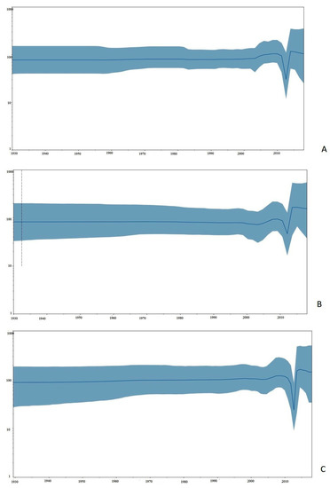Bayesian Skyline plots (BSP) depicting temporal changes in the relative genetic diversity of PPRV isolates (n = 103) collected over a period of five decades (1969–2018) across the globe. Line plots summarize estimates of the effective population size (y-axis) for full genome and the shaded regions correspond to the 95% HPD. (A): Bayesian skyline plot estimated by strict molecular clock. (B): Bayesian skyline plot estimated by uncorrelated exponential deviation clock (UCED). (C): Bayesian skyline plot estimated by uncorrelated log-normal clock (UCLN).