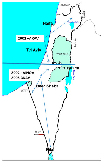 In February 2002, the first cases of blind newborn calves (one of the most characteristic pathological features of AH-S) appeared in the northern regions of Israel [14]. The new clinical cases were reported by field practitioners, and all of them occurred in the above latitude 31°00′. Since the disease is mainly seasonal, covering the Israeli winter and early spring, it was postulated that the malformations seen in 2002 resulted from viral attacks that had probably occurred in the late summer-early autumn of 2001. Simbu serogroup viruses were the suspected etiological agents responsible for the 2002 outbreak of blind newborn calves, similar to what had occurred with AKAV in the 1969–1970 outbreak [8,9,10,11,12,13] (Figure 2). The primary epidemiological tool available at that time was to conduct a case-control study. Therefore, Simbu virus seroprevalence and seroreactivity were compared between affected ruminant herds above latitude 31°00′ (target group) vs. those located below that latitude (control group). Sera collected during the outbreak were submitted for specific virus-neutralization tests (VNTs) against a panel of selected Simbu serogroup viruses. The clear-cut sero-neutralizing outcome indicated that AKAV was the sole attributive infective agent of the 2002 AH-S outbreak. However, an additional virus was found to be circulating in our region—AINOV [14,15] (Figure 2). AH-S reappeared again between February and May 2003 in the south of Israel below latitude 31°00′. The malformations in the south were thought to be the consequence of the same epizootic virus as in 2002 that had spread during the 2001 AKAV outbreak [14,15]. It seems that the ruminant population remained serologically unprotected and therefore suffered a subsequent AKAV attack that infected the naïve population housed with the southern dairy cattle herds.
