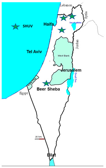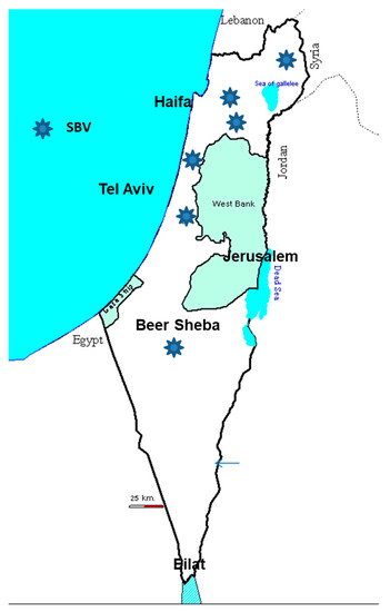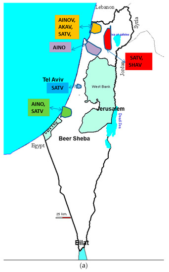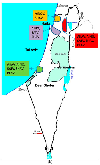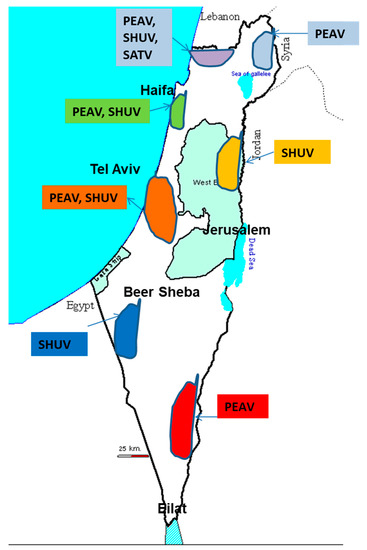 In December 2014, SHUV was isolated for the first time in Israel. This first case originated from a malformed lamb belonging to a herd that had exhibited multiple cases of neonatal malformation and decreased progeny prolificacy. Additional samples from 15 clinical cases from cattle, sheep and goats were also SHUV PCR positive. Most of the reported and confirmed clinical cases were from the northern Israeli valleys, but one was from a sheep housed in a nomadic herd in the north marginal of the Negev Desert [6,16]) (Figure 5). Interestingly, both SHUV elicited cerebral-neurological manifestations, rabies-like, in adult and parturient cows in Israel similar to those reported in 2012 that were linked to AKAV infection [5,6,16].