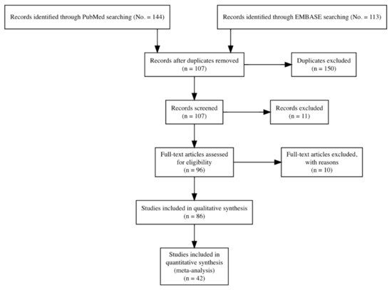 Initially, 257 entries were identified, including a total of 144 abstracts from PubMed, and 113 from EMBASE: as 150 of them were duplicated across the sources, 107 entries were initially screened.