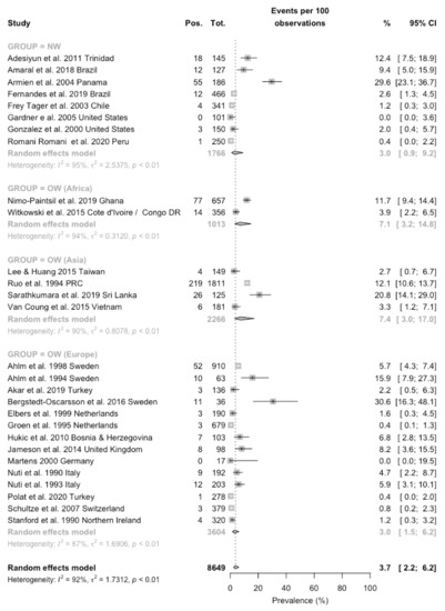 Forest plot representing the estimated pooled prevalence for seropositive status for hantaviruses among agricultural workers. Pooled prevalence rate was estimated in 3.7% (95% CI 2.2–6.2), with estimates that were considerably greater in studies performed in Asian countries (7.4%, 95% CI 3.0–17.0), followed by African countries (7.1%, 95% CI 3.2–14.8), European (3.0%, 95% CI 1.5–6.2) and American countries (3.0%, 95% CI 0.9–9.2). Notes: OW = Old World (i.e., Eurasia and Africa); NW = New World (North and Central/South America).