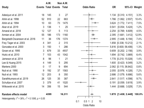 Occurrence of the seropositive status was compared with the reference non-exposed population when available [15,16,18,19,21,22,23,26,29,30,31,33,34,49,50,52,55,61]. A pooled OR equals to 1.875, 95% CI 1.438–2.445, was eventually calculated, with moderate heterogeneity (I2 = 37.9%, τ2 = 0.109, Q = 28.97, p = 0.048) (Figure 3).