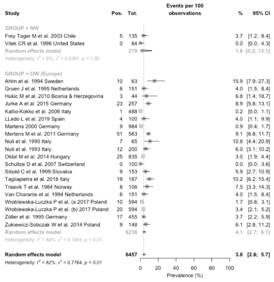 Forest plot representing the estimated pooled prevalence for seropositive status for hantaviruses among forestry workers. Pooled prevalence rate was estimated in 3.8% (95% CI 2.6–5.7), with estimates that were considerably greater in studies performed in European countries (4.1%, 95% CI 2.7–6.1), compared to North and South American countries (1.6%, 95% CI 0.2–13.1). Notes: OW = Old World (i.e., Eurasia and Africa); NW = New World (North and Central/South America).