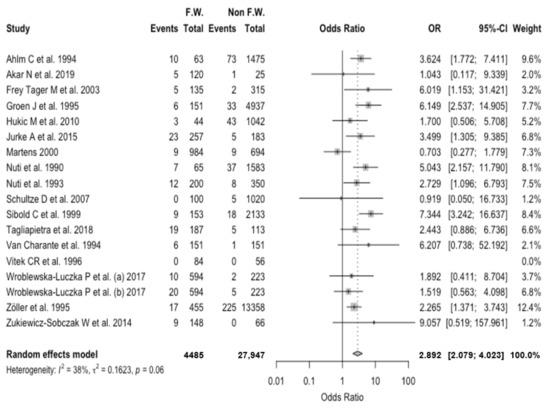As shown in Figure 5, a pooled OR equal to 2.892, 95% CI 2.079–4.023 was eventually calculated, with moderate heterogeneity (I2 = 38.1%, τ2 = 0.162, Q = 25.84, p = 0.056).