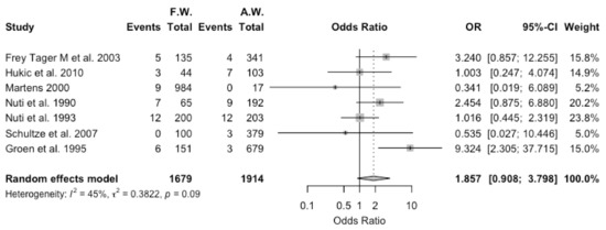 Estimates for agricultural workers and forestry workers were compared for the eight studies that reported on both occupational groups. However, as in one of the studies [30] agricultural and forestry workers were included in the same exposure group, it was excluded from the final calculations. The seven studies [15,18,21,22,23,49,55] included a total of 1679 forestry and 1914 agricultural workers, with 42 (2.5%) and 38 (2.0%) seropositive workers. A pooled OR of 1.857, 95% CI 0.908–3.798 was eventually estimated, with moderate heterogeneity (I2 = 44.7%, τ2 = 0.382, Q = 10.85, p = 0.093) (Figure 6). In other words, no significant differences between agricultural and forestry workers were found for studies that included both occupational groups.