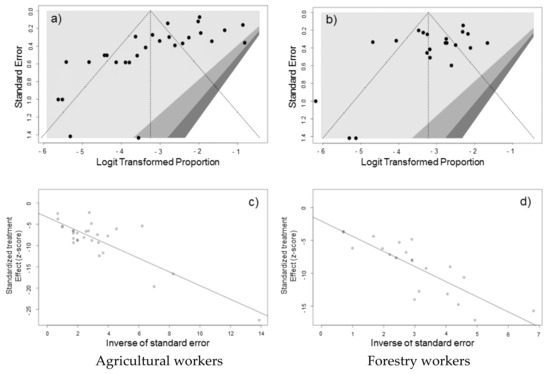 The presence of publication bias was evaluated using funnel plots and regression tests for funnel plot asymmetry, separately for studies reporting on agricultural and forestry workers. Each point in funnel plots represents a separate study and asymmetrical distribution indicates the presence of publication bias. First, studies’ effect sizes were plotted against their standard errors and the visual evaluation of the funnel plot suggested a significant publication bias (Figure 7a,b). Such subjective evidence from the funnel plot was only partially confirmed after the regression test. In fact, Egger test ruled out publication bias for forest workers (i.e., t = −1.81, df = 20, p-value = 0.0857) while it was confirmed for agricultural workers (t = −3.92, df = 26, p-value = 0.0006 for forestry workers). On the other hand, in radial plots for studies on agricultural workers and forestry workers (Figure 7c,d), estimates were substantially scattered across the regression line, suggesting no significant small study effect.