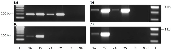 PCR-based detection of cacao mild mosaic virus (CaMMV) and cacao yellow vein-banding virus (CYVBV) in cocoa. A 193 bp (a) and a 861 bp (b) fragment of CaMMV, and a 183 bp (c) and a 802 bp (d) fragment of CYVBV targeting RT-RNase H region were amplified from cocoa accessions ICS 27 (1), ICS 76 (2) and RIM 52 (3) received from Trinidad. Letters A or S represents asymptomatic and symptomatic leaves, respectively. NTC stands for no template control and letter L denotes the lane loaded with 100 bp (a,c) or 1 Kb ladder (b,d).