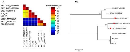 Molecular phylogenetic analyses of eight 861 bp nucleotide sequences of cacao mild mosaic virus (CaMMV) RT-RNase H region obtained in this study (ICS 27; ICS 76), extracted from CaMMV complete genome of isolates from Brazil (BR321 MW052521; BR322 MW052522), Puerto Rico (PR3 MW052520) and Trinidad (SCA 06 KX276640), and CaMMV polyprotein gene, partial cds of isolates from Puerto Rico (PR771ART MT253659; PR771BRT MT253660). (a) Pairwise comparisons were conducted using Sequence Demarcation Tool version 1.2 [21] (b) The evolutionary history was inferred by MEGA7 [22] by using the Maximum Likelihood method based on the Kimura 2-parameter model [23]. The percentage of trees in which the associated taxa clustered together is shown next to the branches. A discrete Gamma distribution was used to model evolutionary rate differences among sites. The tree is drawn to scale, with branch lengths measured in the number of substitutions per site. Red square before taxa names represent CaMMV isolates identified from RIM 52 accession in Puerto Rico.
