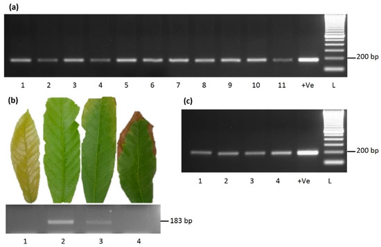 For the determination of possible variation in virus titre with developmental stages, four leaves from three consecutive flushes were sampled from accession IMC 85. No amplification was found in flush or very old leaf samples. A brighter band was amplified from the fully expanded young leaf, whereas a faint band was found in the old leaf sample (Figure 3b).
