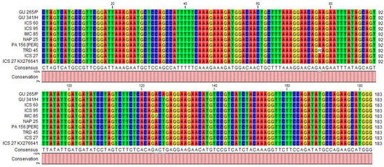 An expected, the size band of the 183 bp RT-RNase H region of CYVBV was amplified in 11 accessions: GU 144/C, GU 219/F, GU 265/P, GU 341/H, IMC 85, JA 10/12 [POU], ICS 60, ICS 95, NAP 25, PA 156 [PER] and TRD 45 (Table 1, Figure 3a). Alignment of the sequencing data obtained from eight samples revealed that five samples from accessions GU 341/H, ICS 60, ICS 95, NAP 25, PA 156 [PER] were 100% identical with the reference sequence (GenBank accession KX276641). Samples GU 219/F, IMC 85 and TRD 45 varied by one SNP with the reference sequence. The SNP found in TRD 45 is heterozygous in nature (Figure 4).