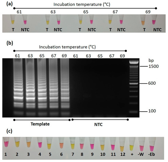 Optimization and testing of colorimetric Loop-mediated isothermal amplification (LAMP) for detection of cacao yellow vein-banding virus (CYVBV). (a) LAMP reaction containing 50 ng of DNA of symptomatic ICS 27 sample (T) or without DNA (NTC) were incubated at 61, 63, 65, 67 and 69 °C. After 30 min, samples were removed from the thermal cycler and cooled on ice to stop the reaction. Photograph shows the pink to yellow colour change in the reaction with template DNA. (b) The RT-LAMP reaction products were analysed on a 2% agarose gel. The typical band pattern of a successful LAMP reaction was visible in the reactions those contain ICS 27 DNA and showed colour change from pink to yellow. (c) Twelve LAMP reactions that contained 50 ng DNA of 12 samples GEBP 509/A-F (1), GU 144/C (2), GU 219/F (3), GU 263/V (4), GU 265/P (5), GU 341/H (6), IMC 85 (7), NA 70 (8), PA 175 [PER] (9), PA 156 [PER] (10), SHRS 09 (11), TRD 45 (12), along with a positive control ICS 27 (+) and two no template controls (-W -Eb), were incubated at 65 °C for 45 min. Photograph shows the pink to yellow colour change in positive samples.