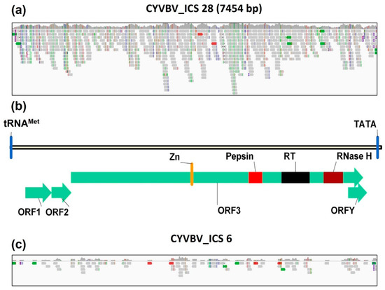 Mapping of sequence reads against reference genomes identified a complete genome of CYVBV in the SRR7961402 dataset in BioProject PRJNA486150, generated from a leaf sample library of cocoa accession ICS 28 from ICGT, Trinidad. The viral sequence identified had a sequencing coverage of 8.2× (Figure 6a).