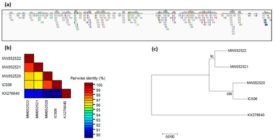 Screening of 10 datasets in BioProject PRJNA77799 identified, in the SRR377712 dataset, a partial genome of CaMMV that covers 74.9% of the CaMMV reference genome (GenBank accession MW052520). This particular library was constructed from a leaf obtained from accession ICS 6 held at the TARS in Puerto Rico (Figure 7a). The consensus sequence was extracted and aligned with four CaMMV genomes. The consensus sequence of the ICS 6 isolate (excluding gaps) showed high nucleotide identity of 98.1% with CaMMV isolate PR 3 from Puerto Rico, as expected. The nucleotide sequence of ICS 6 was 96.3 and 96.5%, identical with CaMMV isolates BR 321 and BR 322 (GenBank accessions MW052521, MW052522) identified in Brazil (Figure 7b,c).