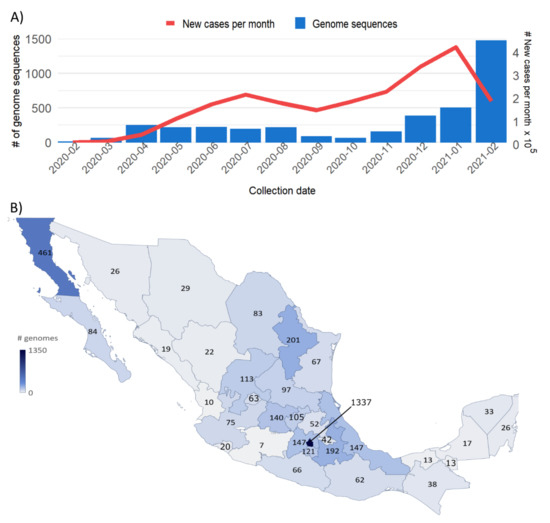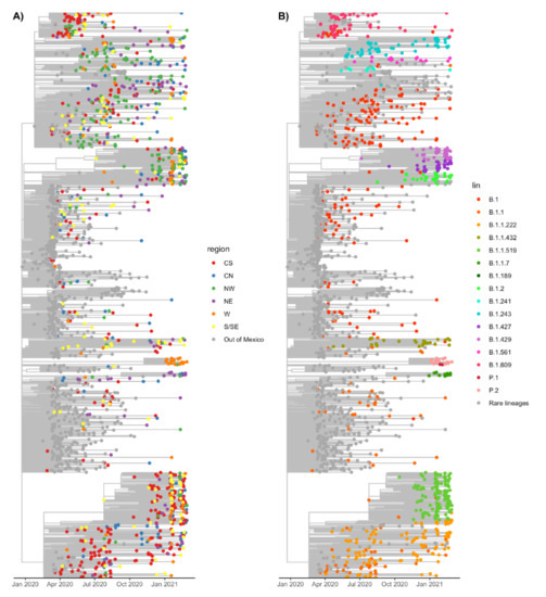 3.4. Global Genetic Diversity of SARS-CoV-2 in Mexico