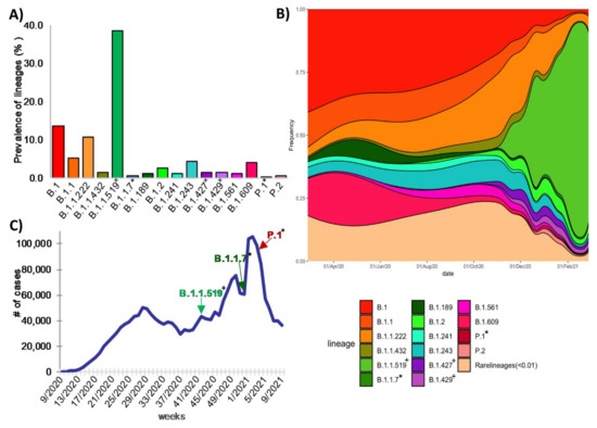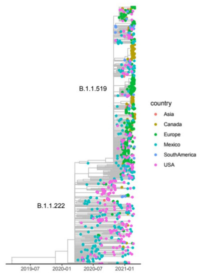 - Rodríguez-Maldonado, A.P.; Vázquez-Pérez, J.A.; Cedro-Tanda, A.; Taboada, B.; Boukadida, C.; Wong-Arámbula, C.; Nuñez-García, T.E.; Cruz-Ortiz, N.; Barrera-Badillo, G.; Hernández-Rivas, L.; et al. Emergence and Spread of the Potential Variant of Interest (VOI) B.1.1.519 of SARS-CoV-2 Predominantly Present in Mexico. Arch. Virol. 2021, 166, 3173–3177. [Google Scholar] [CrossRef]