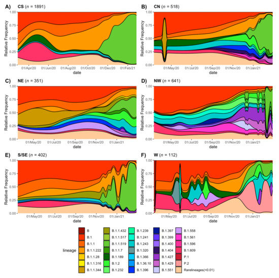 - Alteri, C.; Cento, V.; Piralla, A.; Costabile, V.; Tallarita, M.; Colagrossi, L.; Renica, S.; Giardina, F.; Novazzi, F.; Gaiarsa, S.; et al. Genomic Epidemiology of SARS-CoV-2 Reveals Multiple Lineages and Early Spread of SARS-CoV-2 Infections in Lombardy, Italy. Nat. Commun. 2021, 12, 434. [Google Scholar] [CrossRef] [PubMed]