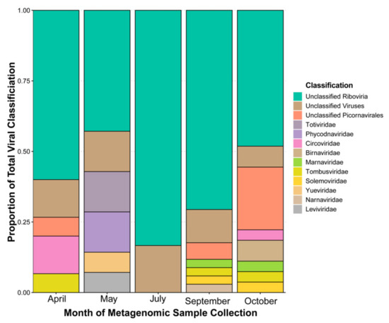 Proportion of contig viral classification (to family when possible) by each metagenomic sample month in 2018. Classifications are based on previously described database alignments by Blast. Only results of the Domain viruses are included. Total number of viral classifications by month were 15 for April, 14 for May, 18 for July, 34 for September, 27 for October.