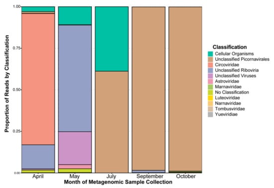 When observing the proportion of reads for each classified contig (including cellular organisms and contigs without a classification (i.e., no match to a database; Figure 2)), we can attempt to infer the most relatively abundant classifications from a sequencing data perspective. In the month of April, a single contig with a Circoviridae hit recruits most (77%) of the reads, for May both unclassified Riboviria and “unclassified virus” hits recruit the majority of reads. For the months of July, September, and October, unclassified members of order Picornavirales dominate the read recruitments. This classification is based on only two putative full-length contigs (two viruses in theory) that recruits nearly half of the September reads each. Only one of these two contigs recruits reads in the July dataset (60%), whereas the other contig recruits most of the October reads (98%) (see Table S2).