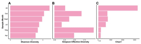 Alpha diversity indices of Illumina MiSeq metagenomic assemblies (contigs) as calculated by MerCat on k-mers of 21 bp, with a minimum count of 5 for each “k-mer species”. Indices include (A) Shannon’s diversity index, (B) Simpson’s diversity index, and finally (C) the Chao1 k-mer measures the number of k-mer species qualifying based on minimum count parameter. Sample months are indicated. The sample denoted “All” is an assembly of all reads from each Illumina MiSeq dataset combined.