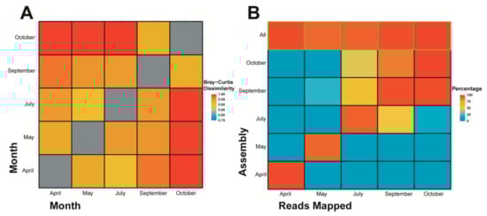 An inter-community species diversity (i.e., beta diversity) comparison using Bray-Curtis dissimilarity on k-mer species (Figure 4A) indicates that the distribution and composition of k-mer species between samples differs considerably (all values are over 0.90), however October and September are more similar when compared against other samples, additionally October individually contains more differences compared to April/May/July than September to April/May/July. July is most similar to May, whereas May and April are most similar to each other. A second interspecies comparison was done using reads mapped to contigs (Figure 4B), whereby the proportion of reads from each sample mapped to assembled contigs from each sample indicates the similarity or dissimilarity between samples. When considering all reads, and not just k-mer species (at a count of five or more) from contig assemblies as the Bray-Custis index did, October and September maintain strong similarities to one another, July has a stronger overlap with both October and September when compared with May and April, and finally May and April do not have strong similarity to one another. This last point being in contradiction to the k-mer based assessment (Figure 4A). The “all” contigs represent the assembly constructed from all samples’ reads and simply shows that a high percentage of the reads from each sample were recruited in the assembly of the combined reads contigs.