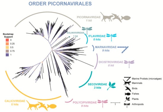 - Vlok, M.; Lang, A.S.; A Suttle, C. Application of a sequence-based taxonomic classification method to uncultured and unclassified marine single-stranded RNA viruses in the order Picornavirales. Virus Evol. 2019, 5. [Google Scholar] [CrossRef]