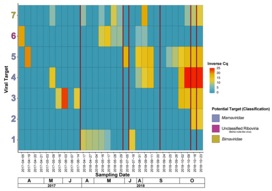 Occurrence and relative intra-species (i.e., viral population) abundance over a time series of 2017 and 2018 sampling dates, including metagenomic samples, using an RT-qPCR assay. An inverse of the quantitation cycle (Cq) is represented (45 cycles minus the Cq value), where a higher value indicates a higher relative abundance. The period between two samples where a microalgal culture die-off occurred in the basin are represented by vertical red lines (5 in total). Further information on RNA viral targets (1–7) is included in Table S3.
