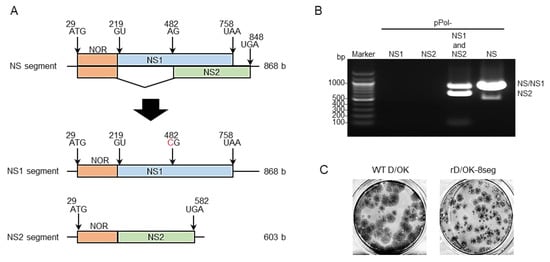 As a constructional strategy, we sought to use a reverse genetics system [] to generate recombinant IDV with two NS segments modified from the original NS segment, where one segment transcribes the NS1 gene alone (namely the NS1 segment) and the other segment transcribes the NS2 gene alone (namely NS2 segment). To construct a viral RNA (vRNA)-synthesis plasmid for the NS1 or NS2 segment, we inactivated the splicing acceptor site of NS2 pre-mRNA by introducing A to C substitution for the former and deleting the intron sequence of NS2 pre-mRNA for the latter (Figure 1A). Thereafter, we transfected HEK293T cells with these modified plasmids together with PB2, PB1, P3, HEF, NP, and M vRNA-synthesis plasmids and PB2, PB1, P3, and NP protein expression plasmids, and finally, inoculated the supernatant into swine testicle (ST) cells. Cytopathic effects (CPE) were observed in the ST cells and both NS1 and NS2 vRNAs were detected in the supernatant (Figure 1B), which formed plaques (Figure 1C). These findings suggest the successful generation of a virus possessing eight-segmented RNAs (namely rD/OK-8seg) (Table 1).