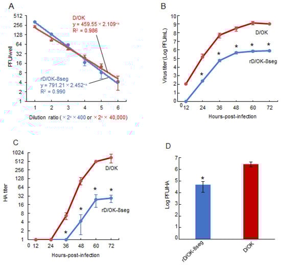 Growth properties of rD/OK-8seg. (A) We evaluated the correlation between dilution ratio and number of plaques in the diluents of rD/OK-8seg or D/OK, where two-fold dilutions from 400-fold for the former or 40,000-fold for the latter, respectively, were employed. Plaque numbers at each dilution are expressed as the mean titer with standard deviations (n = 3). The coefficient of determination (R2) was determined by regression analysis for each virus. Growth kinetics of rD/OK-8seg and D/OK was examined in ST cells (MOI of 0.0001). Viral titers were determined at 12 h intervals post-infection by (B) plaque assay or (C) HA assay and reported as the mean titer with standard deviations (n = 3). ANOVA (a linear mixed model) indicated the significance of the differences (p < 0.01) between growth kinetics of rD/OK-8seg versus D/OK by each assay. The asterisks indicate significant differences at each time-point (p < 0.05 by Holm test as a post hoc test). (D) PFU/HA ratios were determined in rD/OK-8seg and D/OK stocks in ST cells at 60 h post-infection (MOI of 0.0001) and reported as the mean titer with standard deviations (n = 3). The significance of the differences (p < 0.05) between two viruses was evaluated by the two-tailed Student-t test.