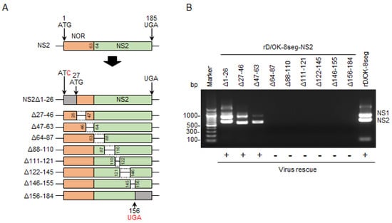 A series of NS2 vRNA-synthetic plasmids with deletion mutations were prepared. To construct a plasmid with deletion of nt positions 1–78 (pPol-D/OK-NS2Δ1-26), the start codon (ATG) of the NS2 gene was replaced with ATC, resulting in translation starting from the 27th codon (ATG), which led to the deletion of the N-terminal region at amino acid (aa) positions 1–26. We also constructed pPol-D/OK-NS2Δ27-46, Δ47-63, Δ64-87, Δ88-110, Δ111-121, Δ122-145, or Δ146-155 plasmids, in which the nucleotide sequences constituting amino acids at positions 27–46, 47–63, 64–87, 88–110, 111–121, 122–45, or 146–155 were deleted, respectively. Furthermore, the 156th codon (AAC) was replaced with a stop codon (UAG), thereby resulting in the pPol-D/OK-NS2Δ157-184 plasmid, in which the 156-184th amino acids were deleted.