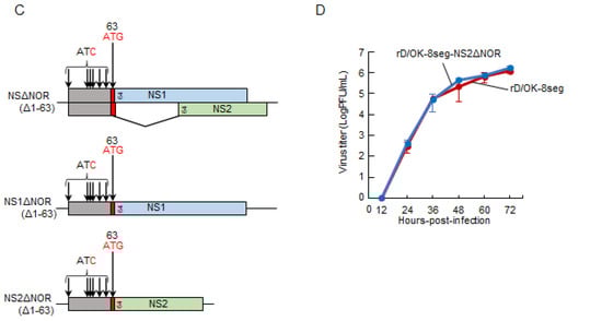 We also modified the pPol-D/OK-NS, -NS1, and -NS2 plasmids to create a mutant virus without the NOR (at aa positions 1–63) between NS1 and NS2 proteins. All ATG codons at nt positions 1–186 in these plasmids were replaced with ATC, and the 63rd codon (GAA) was replaced with ATG, constructing pPol-D/OK-NSΔNOR, -NS1ΔNOR, or -NS2ΔNOR plasmids, which led to the deletion of aa positions 1–63 of NS1 and/or NS2.