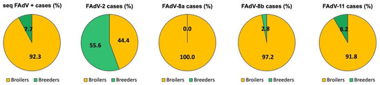 Distribution of sequenced FAdVs and FAdV serotypes by poultry type between 2011 and 2021 in Spain. Percentage of sequenced FAdV positive cases and FAdV serotypes in broilers (yellow) and broiler breeder pullets (green, referred to as Breeders).
