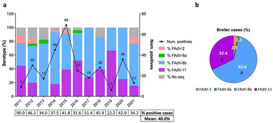 Inter-annual temporal analysis showed an increase in the number of positive broiler cases since June 2011, which peaked in 2015 (n = 69) and subsequently decreased, even though spikes were identified in 2018 (n = 28) and 2020 (n = 36) (Figure 2a). The mean of positivity rates of broiler suspected IBH cases was 40%, ranging from 22.2% (2019) to 90% (2011) (Figure 2a). The distribution of serotypes was similar over the years; FAdV-8b and -11 were consistently identified as the main circulating serotypes, while FAdV-2 and -8a were sporadically detected (Figure 2a). Overall, FAdV-8b was the most frequent serotype detected (63.6%), followed by FAdV-11 (32.4%), FAdV-2 (2.9%), and FAdV-8a (1.1%) (Figure 2b).