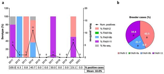 Positive broiler breeder pullet cases were sparsely detected inter-annually, with 2011 (n = 5), 2014 (n = 11), and 2020 (n = 6) the years when most cases were diagnosed (Figure 3a). The positivity rates of broiler breeder pullet suspected IBH cases were very erratic due to the low number of cases (Figure 3a). The distribution of serotypes was equally inconsistent over the years (Figure 3a). Overall, FAdV-2, -11, and -8b were detected in similar percentages (Figure 3b). Serotype FAdV-8a was not detected in broiler breeder pullets.