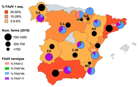 IBH cases for which FAdV serotype was available were classified based on region. IBH cases were submitted from most regions of Spain, with Catalonia (46.1%) and Andalusia (36.6%) the regions with the highest prevalence of positive sequenced IBH cases (Figure 5). Interestingly, a geographical distribution based on serotype was observed; FAdV-8b serotype tended to circulate in North-Eastern regions, while FAdV-11 was more prevalent in South-Western regions (Figure 5).