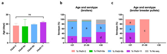 Distribution of FAdV serotypes based on age in meat-type chickens between 2011 and 2021 in Spain. (a) Mean age of IBH-positive broilers and broiler breeder pullets based on FAdV serotype. Statistical significance was declared at p ≤ 0.05. (b) Percentage of FAdV serotypes per age group in broilers. (c) Percentage of FAdV serotypes per age group in broiler breeder pullets. Different letters designate statistical significance in Fisher’s exact test (p ≤ 0.05).