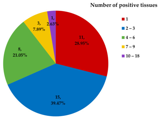 Of the 38 positive animals, 27 (71.05%) were positive regarding more than one tissue, with each positive individual having an average of 3.18 positive tissues (121/38). This average number of positive tissues was 2.29 (78/34) after excluding four positive animals with more than six positive tissues. Positive animals were classified into five groups using the Jenks natural breaks algorithm in R software 3.2.2 (The R Foundation for Statistical Computing, 2014): 28.95% of infected individuals had one positive tissue, 39.47% had 2–3, 21.05% had 4–6, 7.89% had 7–9, and 2.63% had 10–18 (Figure 1).