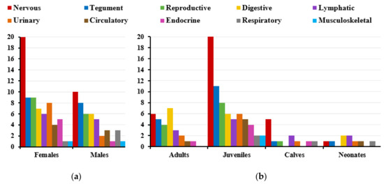 Number of tissues in each organ system that tested positive to HV DNA, stratified by sex (a) and age (b) of the animal. HV DNA was detected in 121 of 966 tissue samples (12.53%), which had the following distribution by sex and age: females (70/439, 15.94%), males (45/498, 9.04%), adults (29/377, 7.69%), juveniles (69/379, 18.21%), calves (12/83, 14.46%), and neonates (9/98, 9.18%).