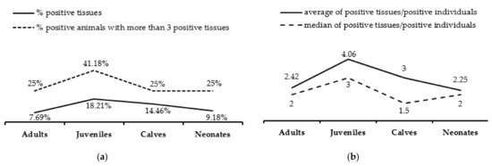 Several age-related differences were observed regarding tissue tropism (Figure 2b). The organ system most frequently infected in juveniles and calves was the nervous system, and this was the second most frequently infected organ system in adults. The system most frequently affected in adults and neonates was the digestive system. The tegument was infected more often in juveniles and in adults. The lymphatic system was infected more often in calves and neonates and to a lesser extent in juveniles. The reproductive system was the second most-often infected system in juveniles and the fourth most-often infected in adults. In contrast, it was found to be infected in only one of four calves and never in neonates (Figure 2b).