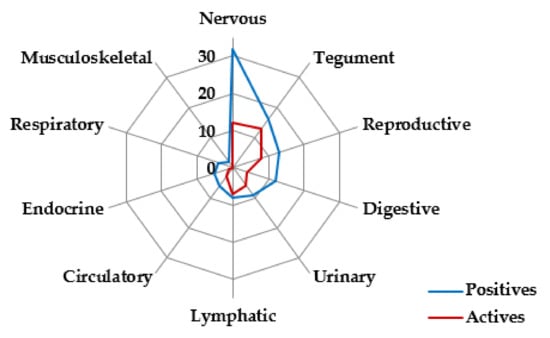 The organ system that had the highest percentage of HV-positive samples (100 * HV-positive samples/number of samples evaluated) was the reproductive system (39.47%), followed by the nervous system (18.93%); the integument (14.40%); the endocrine (13.95%); and the circulatory (12.28%), urinary (11.63%), digestive (10.13%), respiratory (6.78%), and lymphatic (4.64%) systems. The musculoskeletal system was the less frequently infected (4.54%) (Table 1).