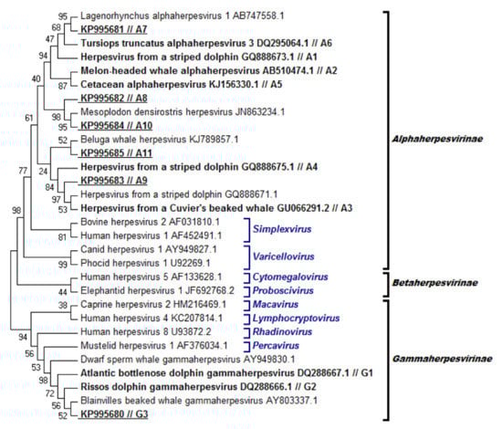 The Herpesviridae family, which comprises the subfamilies Alphaherpesvirinae, Betaherpesvirinae, and Gammaherpesvirinae, can infect a wide range of mammalian species, birds, reptiles, fish, frogs, and bivalves [28]. All HV detected in marine mammals to date belong to the Alpha- or Gammaherpesvirinae subfamilies [29].
