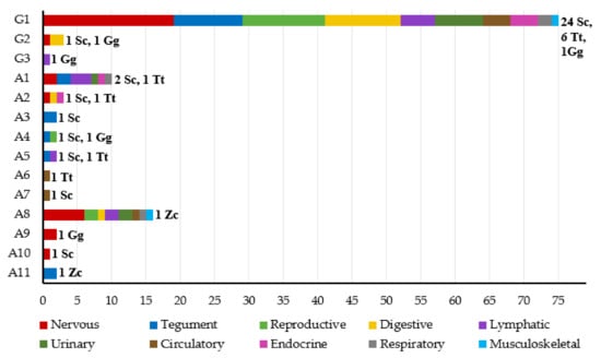 HV detection in cetaceans at tissue level, in addition to being stratified by organ system and species. The percentage of positive samples in each organ system is shown below the name of that system in the leftmost column. Numbers not in parentheses refer to how many samples of the specific tissue from the indicated cetacean were analyzed, and numbers in parentheses refer to how many HV sequences were detected. Thus, “7 (2G)” means that two sequences were identified in seven analyzed samples, and that both belonged to Gammaherpesvirinae. The notation “2G1” means that the sequence G1 was detected twice in the given tissue and species. Sc, Stenellacoeruleoalba; Tt, Tursiops truncatus; Gg, Grampus griseus; Zc, Ziphius cavirostris. The bold parts refer to the total of individuals studied, tissues analyzed and types of sequences detected.