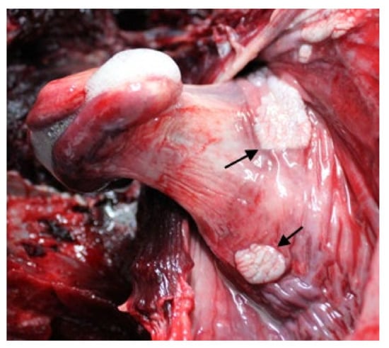 The gross lesions of HV-positive organs were mostly nonspecific, with a predominance of congestion. Relevant lesions were observed only in the reproductive system, the esophageal mucosa, and the integument. The only lesion detected in the genital mucosa comprised two whitish proliferative structures of 1 cm in length, which stood out on the mucosa around the vagina in the genital fissure. The lesions of the esophageal mucosa consisted of ten white structures that were papillomatoid in shape and of varying sizes (between 2 and 5 cm in length, 1–2 cm in width, and 0.2–0.3 cm in relief), with irregular borders, around the larynx (Figure 8). Lesions were detected on the skin of three individuals: dark gray punctate lesions (0.1 cm); dark circular lesions with a slight depression; and an oval lesion (1.5 × 1 cm) with a slight relief, irregular surface, and no change in color, craniolateral to the blowhole.