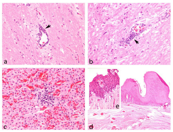 The lesions associated with CeMV were described by Rubio-Guerri et al. [60] and consisted mainly of non-suppurative encephalitis, broncointerstitial pneumonias, and nephritis.