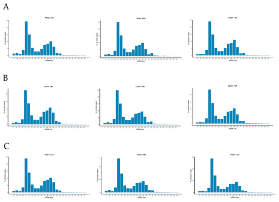 Small RNA profiles of U4.4 cells at 24, 48, and 72 h. (A) Small RNA profile of total reads in mock infected cells; (B) small RNA profile of total read in LamV-infected cells; (C) small RNA profile of total reads in HakV-infected cells.