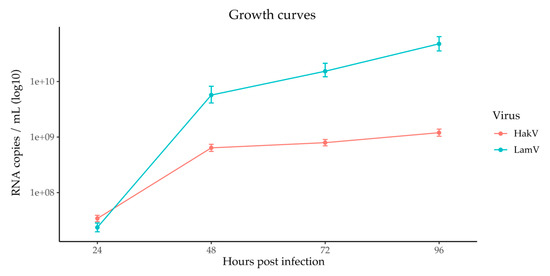 To confirm active viral infection and replication, the supernatant was collected, further processed by RNA extraction and cDNA synthesis, and analyzed with qPCR. The data were used to calculate a growth curve over time (Figure 2). Both LamV and HakV showed steep virus growth during the first 48 h before plateauing. Furthermore, LamV showed a higher replication compared to HakV, with approximately one log more RNA copies at 48 h p.i. and the later timepoints recorded (Figure 2).